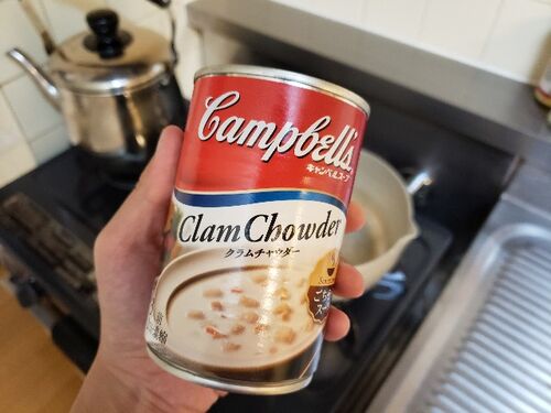こんにちは! かんどーです。今日は缶詰を使った、簡単な本格的スープをご紹介します。 「キャンベル」のクラムチャウダーです! 缶はこんな感じ。こんな缶ひとつで本格派スープが作れるんだからありがたい。 作り方はとても簡単。中身のペーストを全部片手…